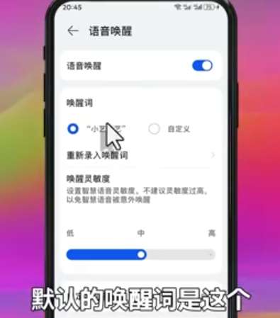 进入设置 > 智慧助手 > 智慧语音 > 语音唤醒,开启开关并录入唤醒词(默认“小艺小艺”)。