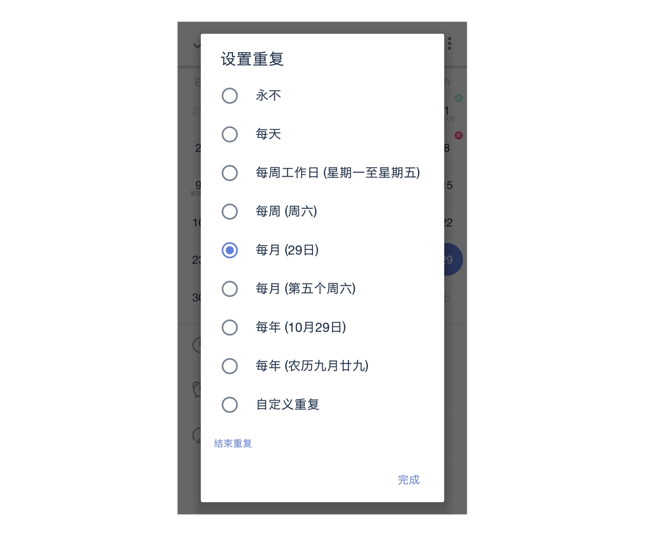 若默认重复中没有你需要的选项,可以通过自定义来设置。