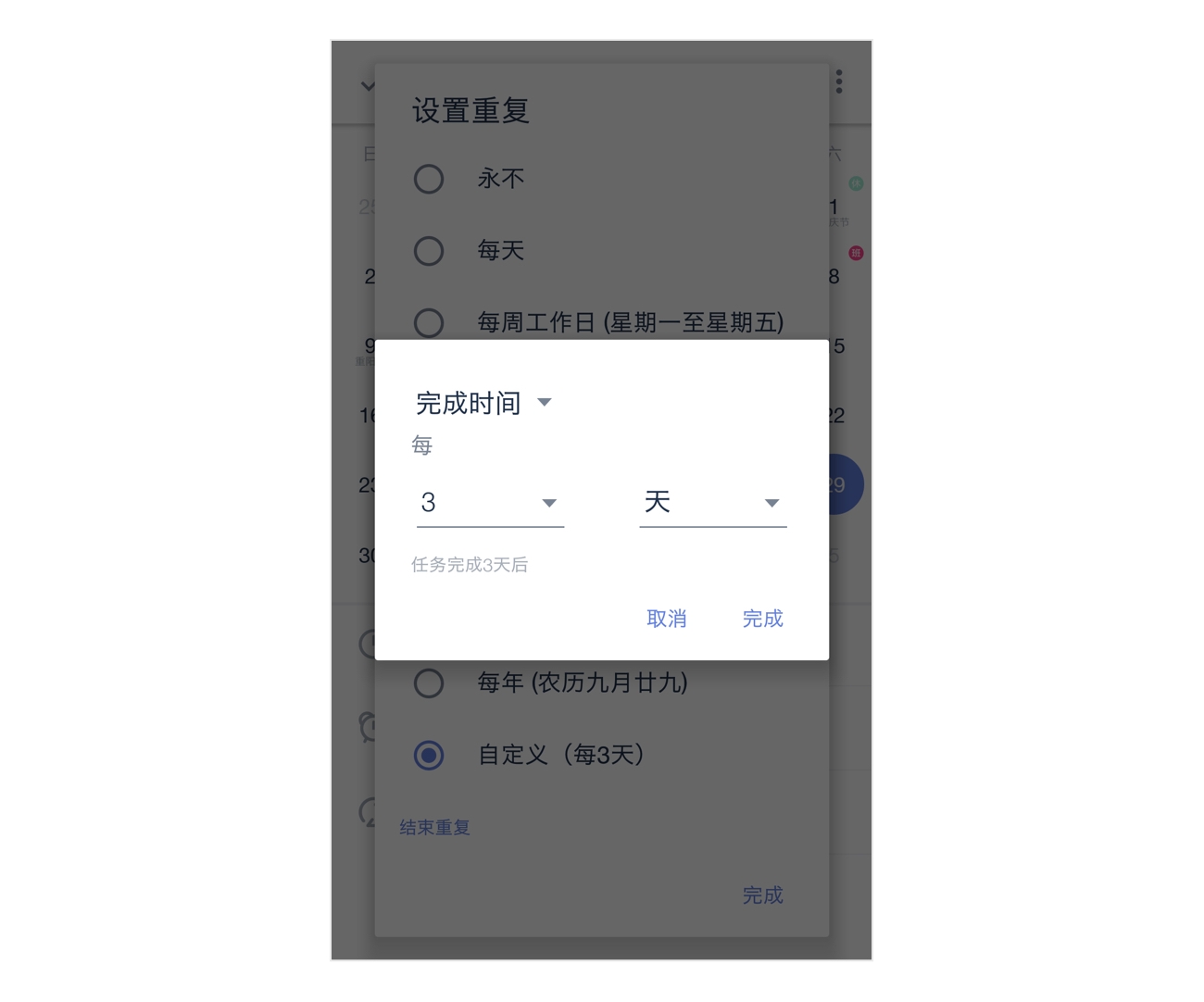 比如每三天一次健身课,选择自定义后,频率选择「每三天」,只要完成了任务,就会自动创建三天后的健身课任务并设置提醒。