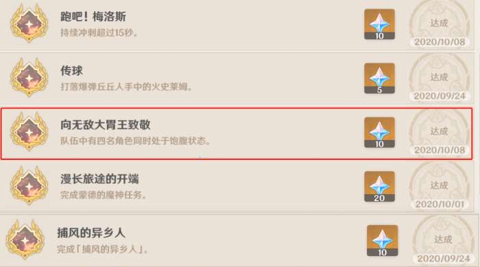 而且这个饱食度还可以触发一个成就,玩家们搜集一些普通的果子,然后给角色们吃,将队伍的四个角色的饱食度都吃到满的话,会解锁一个成就:向无敌大胃王致敬,解锁之后能获得十个原石,还没有解锁这个成就的玩家们可以前往完成了,除了这个玩家们在学习食谱和食物熟练度都达到一定的时候,也是能解锁两个成就的,这个可以在平时的日常当中完成,不得不说原神在成就这一方面设计的相当错,也是让玩家们感受到了不少快乐。