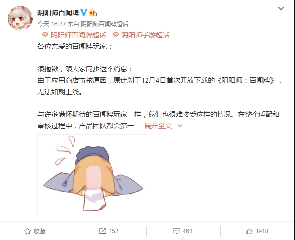 软件提交 专题合集 热门手游原定于12月4日首次开放下载的《阴阳师:百闻牌》因应用商店审核原因,将无法如期上线。12月3日,阴阳师百闻牌官方微博发布延期上线公告,并给出相应补偿。