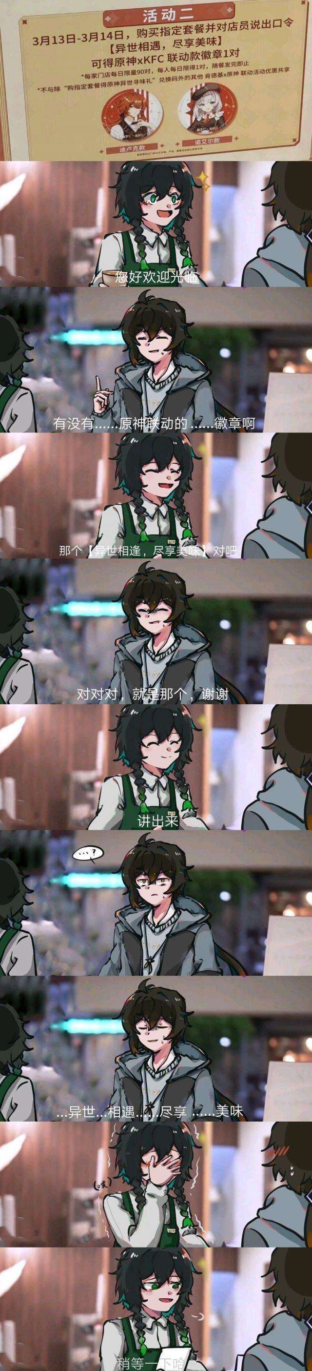 这个活动开始的当天,各个KFC的门店都开始涌入了大量的原神玩家购买原神套餐,从而也会喊出那一句异世相遇尽享美味。