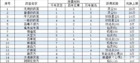 无用的药笺 千年灵芝1 百年玄黄1 万年首乌5 奖励灵尘30 兑换上限20次