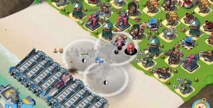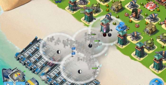 4、放震爆弹:等待烟雾弹快散去,迅速放几发震爆弹,震住大本周围防御,大本前面不用震,可能震不好英雄技能放不出,然且有英雄布利特保护,前面很安全!最后就开始等待胜利吧!(注意:野人对付护盾厚的玩家不好打)