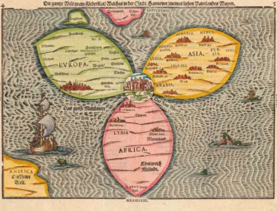 (绘制于中世纪的欧亚非地图,耶路撒冷坐落于世界中心,而北美和英国在世界边缘)