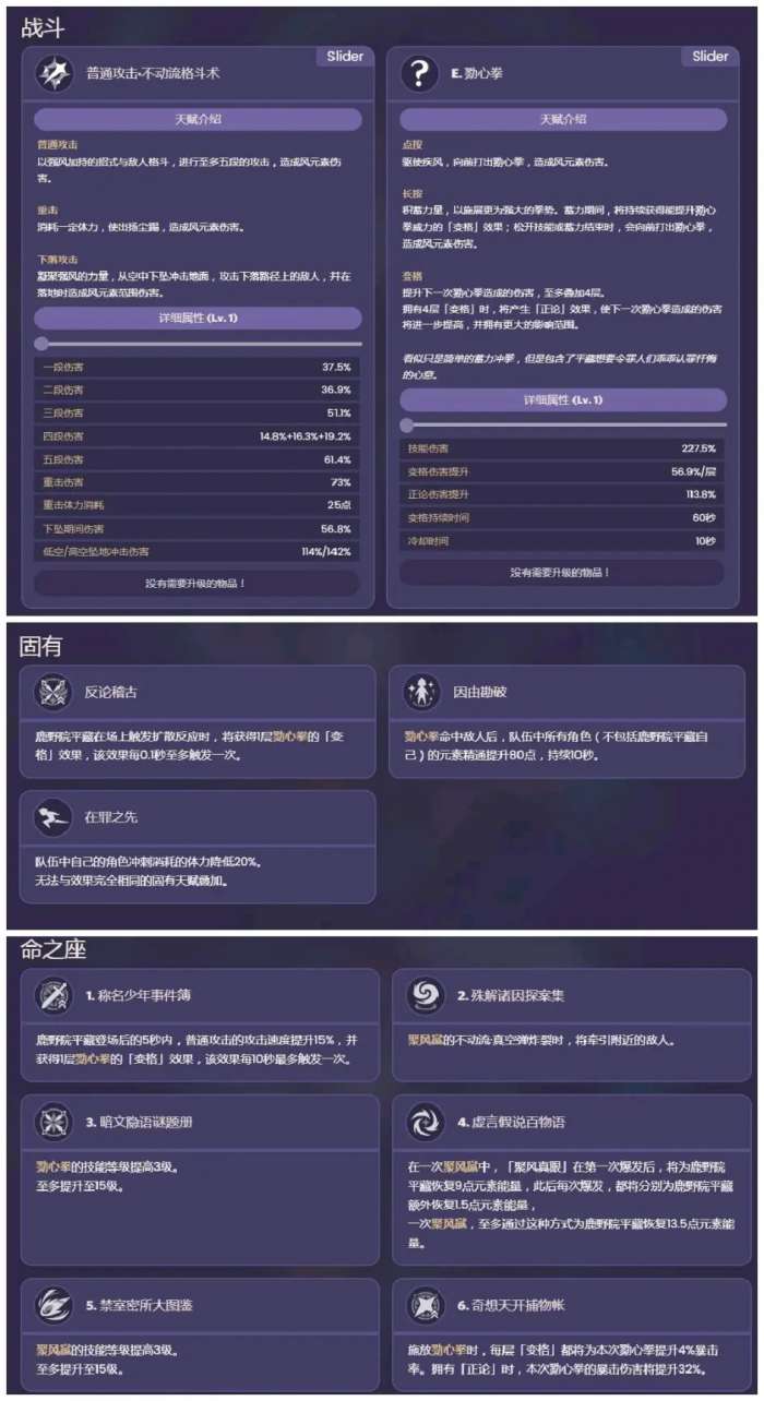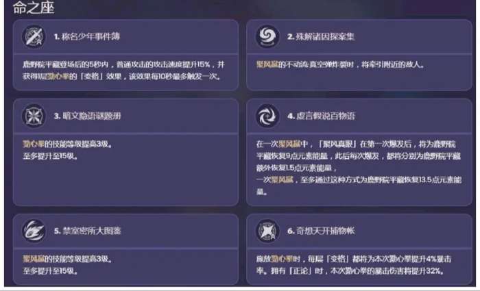 EQ技能和固有天赋一览,加80点精通,算上教官套,200点精通加成,还行。这命座加成,看来鹿野院平藏是个男性风系四星主c啊。6命+32暴击率,看来不是风辅。