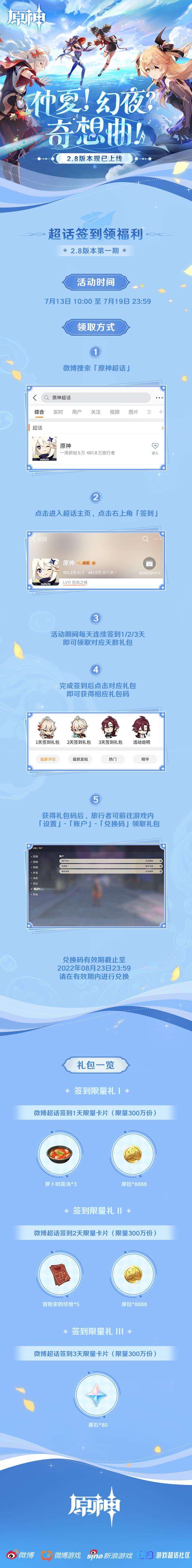 活动期间,在原神超话内连续签到1/2/3天,即可领取并在游戏内兑换对应天数礼包。