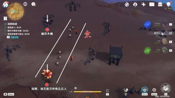 (1)试炼中,可以操纵斯露莎投放「苦离果」。「苦离果」命中场景中的不同物件后,将触发各种效果,影响附近的丘丘人…