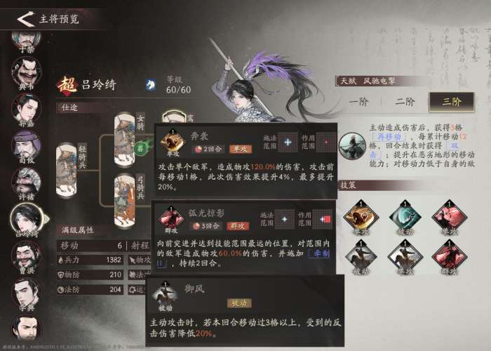 技能推荐:御风,奔袭,弧光掠影。御风与奔袭完美放大了吕玲绮的天赋被动。弧光掠影又让吕玲绮能快速切进战场与敌方进行缠斗。