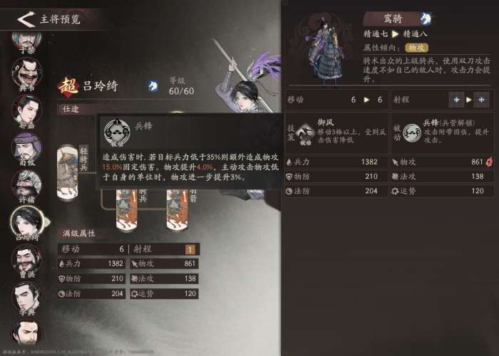 副将推荐:根据吕玲绮需要在战斗中尽量保证高移动的特点。前期可用朱灵进行过渡,后期搭配臧霸与高览充分发挥高移动的特性。