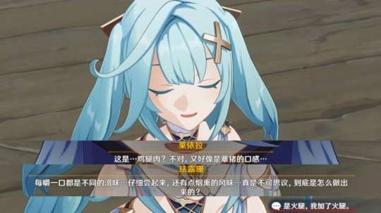 莱依拉:这是……鸡腿肉?不对,又好像是蕈猪的口感……珐露珊:每嚼一口都是不同的滋味……仔细尝起来,还有点烟熏的风味……真是不可思议,到底是怎么做出来的?