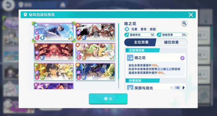 当然了,要是自选礼包里的同元素秘纹已经是玩家所拥有的,且玩家其它元素的虹彩秘纹较少,那选择其它元素的虹彩秘纹作为补充会更为合适,毕竟玩家们不止需要培养一只队伍,因此在主力队秘纹已经拿到手的情况下,为二队、三队挑选秘纹,降低它们的养成压力也不失为一个合适的选择。倘若礼包内所能选的秘纹玩家至少都有一张,那就选与自己主力队元素相同的秘纹,并为该秘纹升星,好令它所提供的技能效果变得更强。各位可看一下自身属于哪一种情况,然后再进行秘纹的选择。