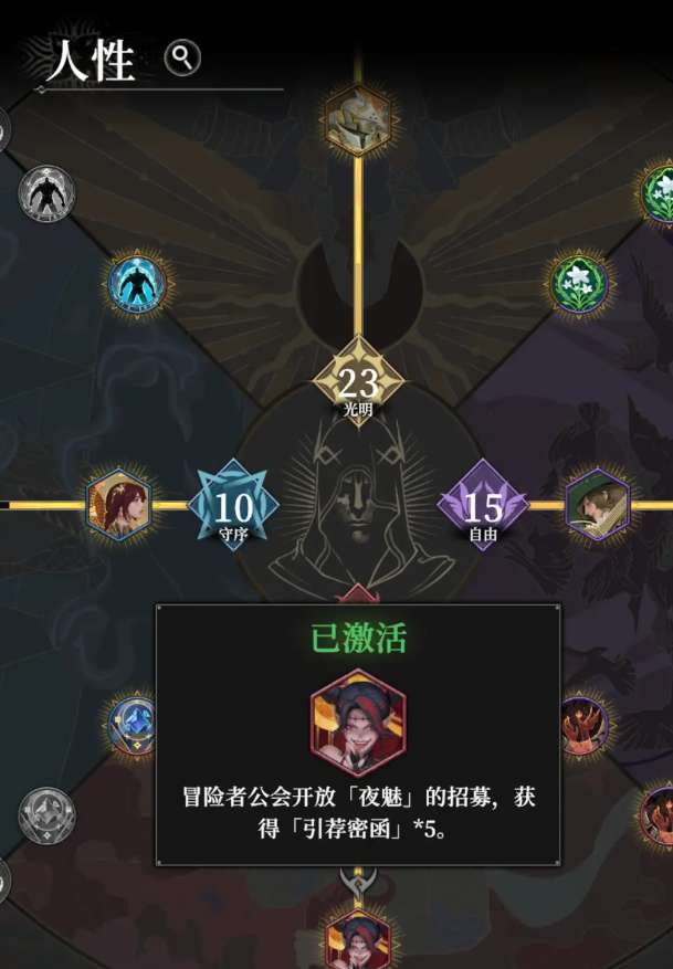 人性属性的影响其实很大,游戏中的许多事件选择都会影响你的人性属性值。这些属性值不仅会影响对话选项和剧情分支,还可能关系到特定英雄的招募(例如光明属性达到12点可以在酒店招募强力的白骑士),以及剧情的最终走向。想要获取属性值的话,可以做出事件选择,几乎每个地图都有众多包含人性选择的事件。