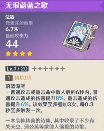 普通攻击或重击命中敌人后的6秒内。普通攻击造成的伤害提升(8%/10%/12%/14%/16%),重击造成的伤害提升(6%/7.5%/9%/10.5%/12%)。该效果至多叠加3次,每0.3秒至多触发一次。