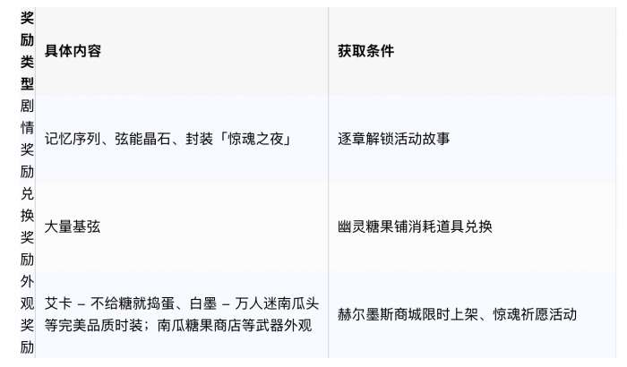 解锁剧情:在「惊魂之夜」板块消耗道具解锁章节故事,每章阅读完毕可直接领取记忆序列、勋章「南瓜头」、弦能晶石等奖励。