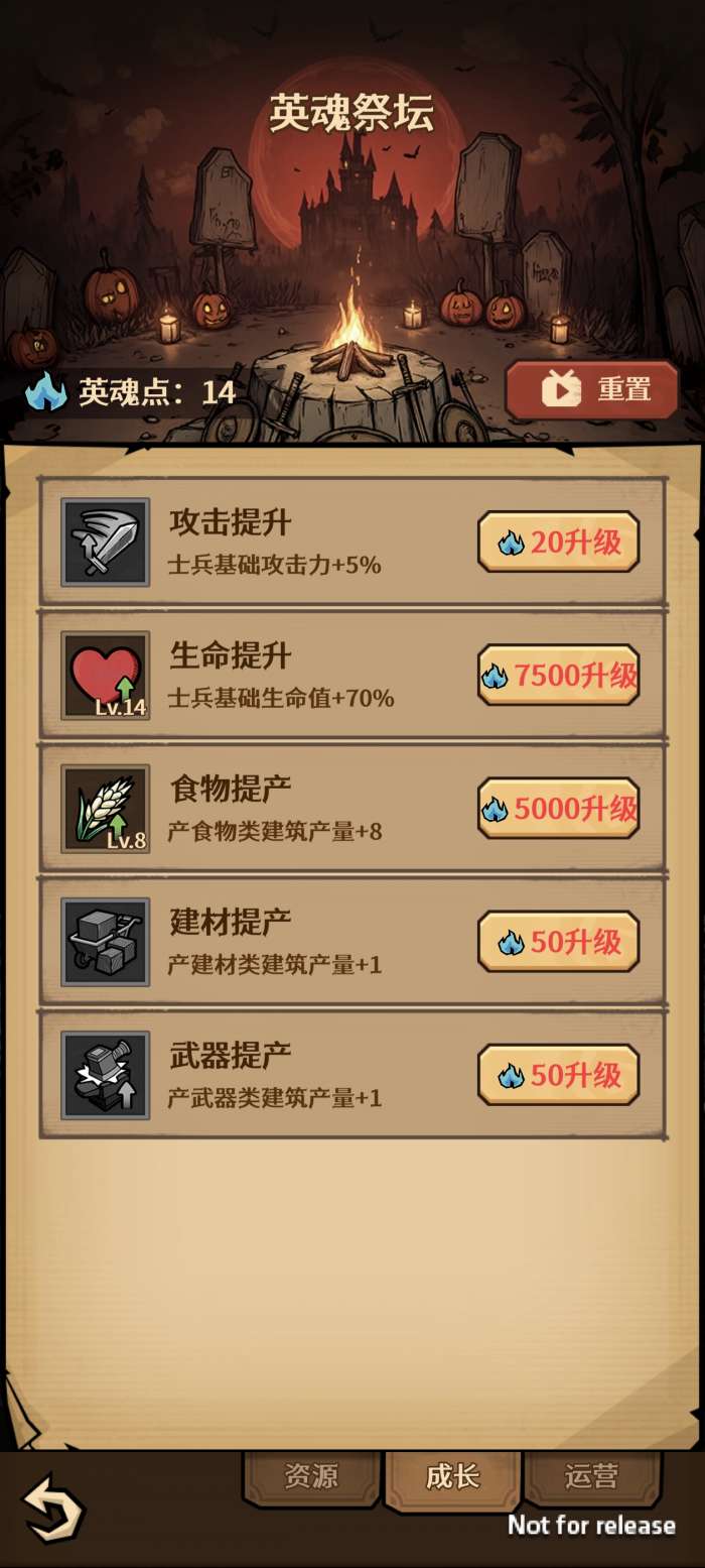 在进行完第一回合之后保存退出然后重置英魂点数,再将必须品出手卡牌额外收益点满,点第二页的食物提产和建筑提产,剩下都点攻击提升,生命提升。
