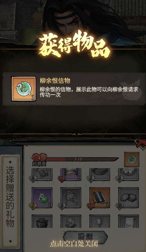 首先通过向侠客【赠礼】的方式,提升与侠客的好感度,获得侠客的专属【信物】(例如:“柳余恨信物”不能用于其他侠客进行传功)。