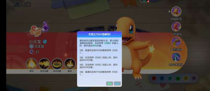 61级解锁的被动技能太阳之力就成为了最后的杀招。让小火龙在攻击附带灼伤的敌人时,可以额外造成40%的伤害,随着技能升级,这一个加成最高就可以达到50%。同时普攻附带灼伤的概率也会提升到75%这就意味着小火龙的技能在把敌人叠满灼伤之后,每一次的普通攻击都会成为致命一击。原本的持续伤害技能也会瞬间变成多重优势。