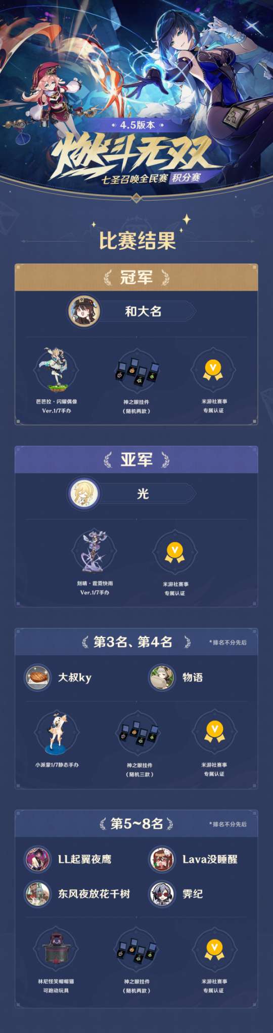 让我们再次祝贺和大名选手获得本届「燃斗无双」米游社七圣召唤全民积分赛的冠军!感谢旅行者的支持,我们下一届「燃斗无双」不见不散!