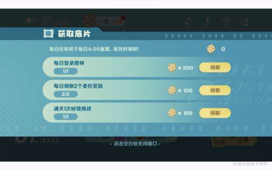 点击界面上方的加号,可以完成每日原神任务,领取底片,解锁新的活动场景。