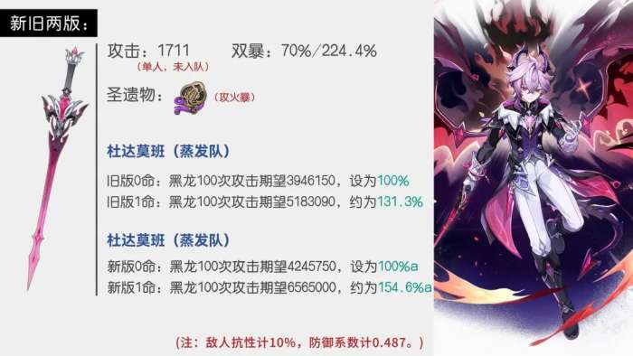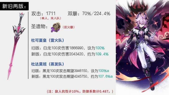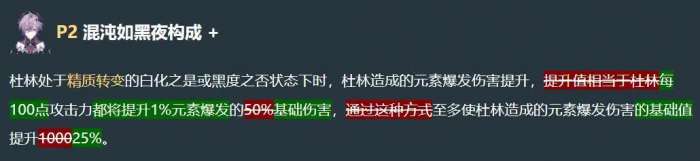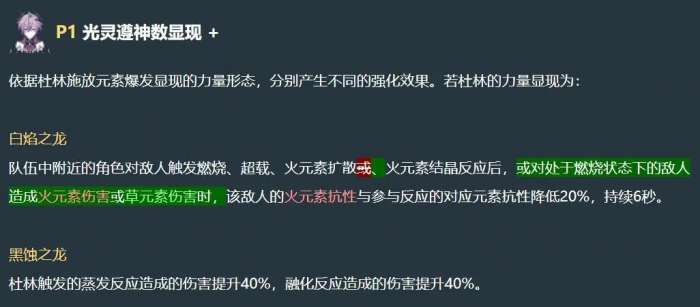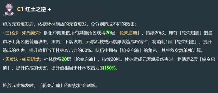 黑度法·如星阴燃:旧版效果为“杜林获得12层轮变启迪,杜林造成元素爆发伤害时,消耗2层轮变启迪提升造成的伤害,提升值相当于杜林攻击力的100%”;