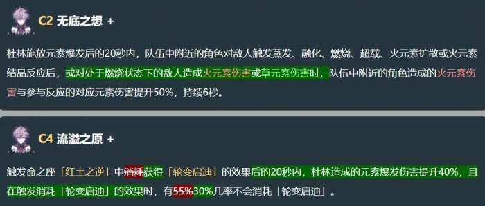新增设定:队伍中附近的角色“对燃烧状态下的敌人造成火元素伤害或草元素伤害时”,也能触发2命的增伤效果。