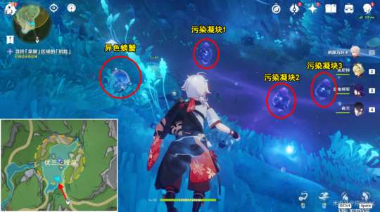 第一步:前往下图位置,获取螃蟹技能,使用螃蟹的防反攻击清除3个污染凝块