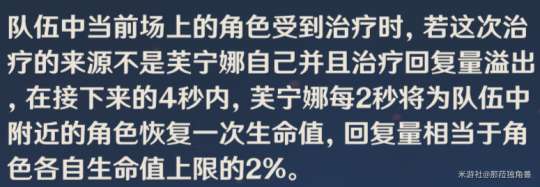 除了聚气元素爆发叠加的治疗效果增益外,当队伍中除了芙宁娜以外的其他角色产生生命回复效果并且超过当前生命值上限时,全队可以获得两次恢复总量为4%最大生命值的治疗效果。