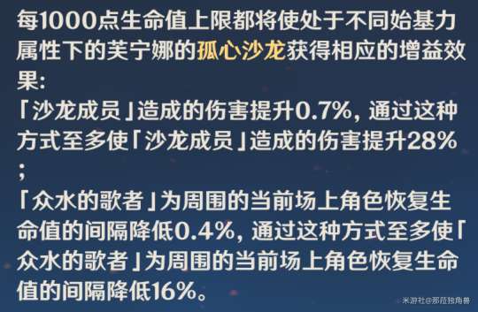 芙宁娜的天赋2可以增加海鲜团的伤害和纯水精灵的治疗,达到最大效果需要40000以上的生命值。然而,并不是所有情况都需要芙宁娜输出伤害,同时水精灵的治疗效果也不是必须考虑的因素。因此,在考虑堆积生命值时,需要视具体情况而定,而且在圣遗物成型困难的情况下,也应该重视技能循环的效率。