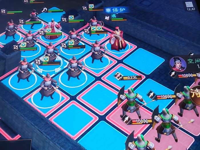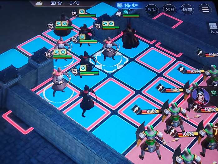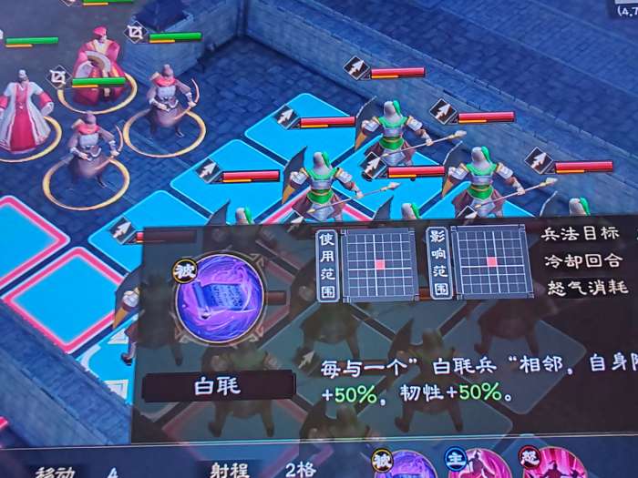本关敌人防御高,反击高,需要合理顺序击杀和适当站位。看白毦兵防御被动,周围同阵营人越多防御越高。因此击杀策略为,先击杀第一排左右两边的白毦兵,其次中间两个,然后下一排同理。援军全部选择弓兵,攻击范围大,策士攻击尽量斜着打,在反击范围外打。