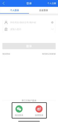 2、在登录页面中可以用户手机账号、微信、微博登录;