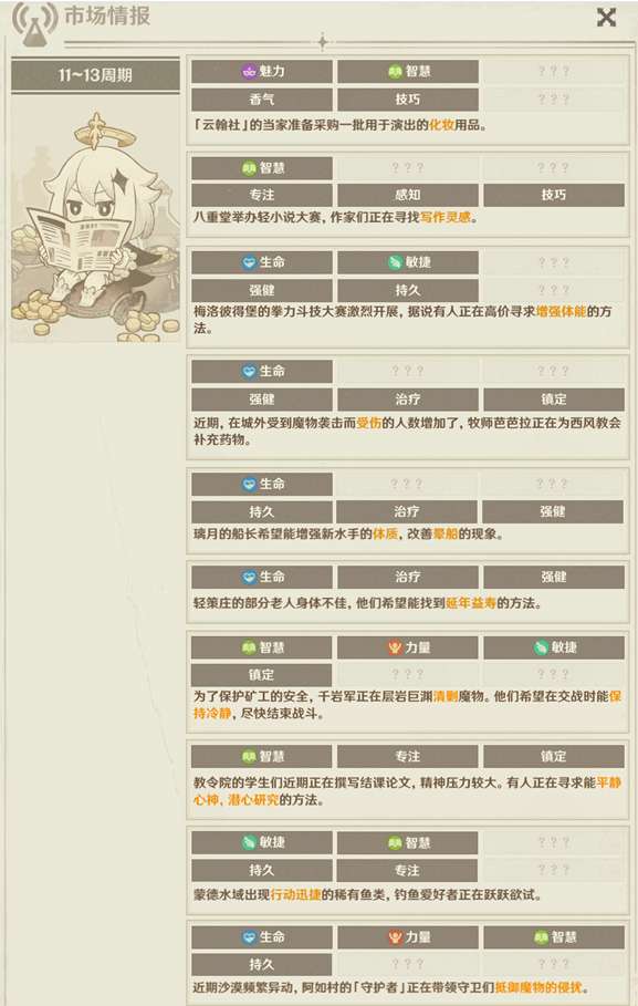软件提交 专题合集 热门手游《原神》升炼研巧万策金第二阶段市场情报11-20周期有哪些?第二阶段的玩法很多玩家都不清楚,这次我们来了解一下最新的市场情报,想要知道第二阶段11-20周期的市场情报,各位玩家可以参考一下。