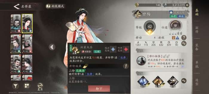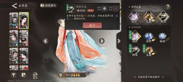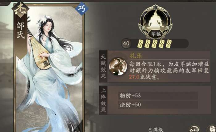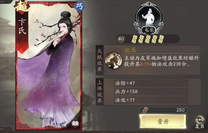 平民顶级辅助,配合副将开局能够让一个角色满战意,还有群攻范围全员+15战意,基本是必带,仅次于再动机制的貂蝉。低压环境建议带甘梅。