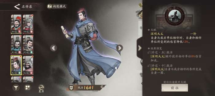 非常强的抗压、buff和奶,不过需要四命才能达到完全体,四命配合被动减冷却,一回合一个群奶+减伤buff,配合副将卞氏全体8.5%攻击力。高压环境建议带李典。
