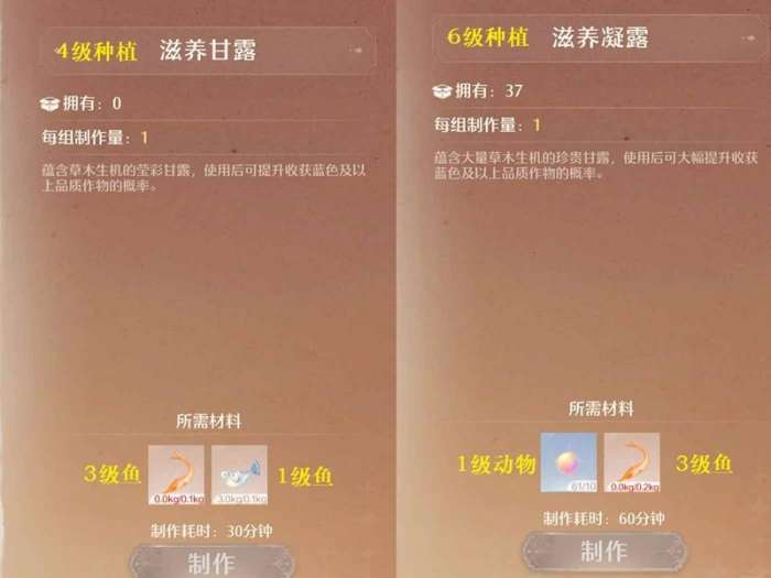 ②:3级养鱼如图可以制作滋养甘露/凝露,可以速刷低等级作物;