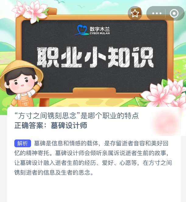 软件提交 专题合集 热门手游“方寸之间镌刻思念”是哪个职业的特点?【蚂蚁新村每日一题】2025年10月28日题目已发布!坚持答题,积累木兰币,即可加速小镇建设。答对本题,立即可享“产速+3/时”的加速奖励!今天正确答案是【墓碑设计师】。墓碑设计师会倾听亲属诉说逝者生前的故事,让墓碑设计融入逝者生前的经历、爱好、心愿等,在方寸之间镌刻逝者的信息及生者的思念。
