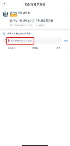 4、输入参赛名会员编号,点击搜索按钮就可以了。