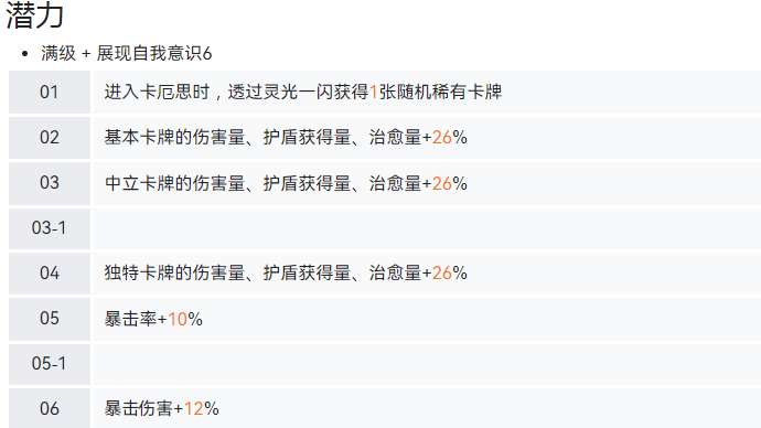 逆流斩可以提供100%的护盾,有效保证生存的能力。准备压制是定向抽取攻击类的卡牌,并且还可以提升20%的伤害,让输出的节奏更加的流畅。独特的卡牌,就会给整个角色带来更多的可能性,其中也会包括偷袭会针对全体敌人形成180%的伤害,所以玩家如果能够合理的去利用,自然就可以发挥优势。潜力系统让整个角色的成长曲线更加的清晰,在满级之后就能有机会获得开局的优势,还可以迅速的提升26%的治愈效果以及护盾效果。