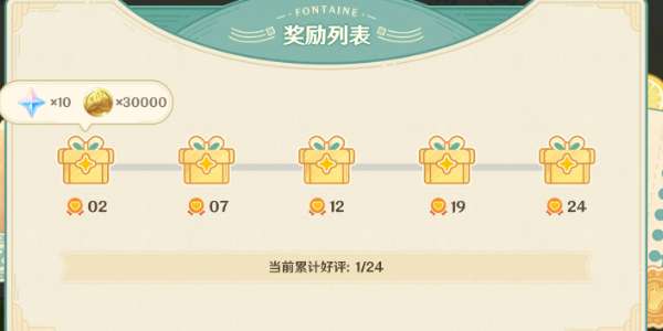 累计获取2、7、12、19、24点顾客好评时,旅行者可以领取对应奖励。全部奖励包括:原石*120、精锻用魔矿*10、大英雄的经验*10、摩拉*70000。