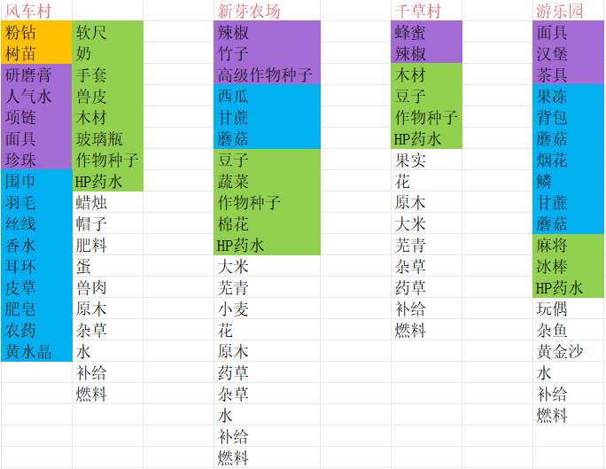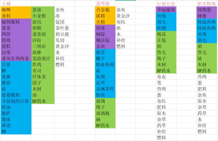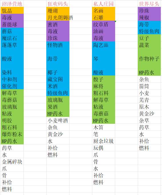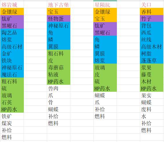以下表格的物品颜色标注为稀有度
