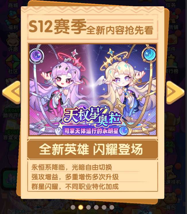 解锁赛季英雄后同步开启伴生系统~开启后,每个永恒系英雄将配套神殿,神殿包含任务、派遣、羁绊、共鸣和萃魂5个模块。获得新英雄后即可开启独立任务,派遣系统每日刷新任务,期间可以领取到各类资源道具;新增英雄羁绊共鸣,从羁绊英雄中选择1个可获得额外加成。更多提升与玩法,就等你来体验~