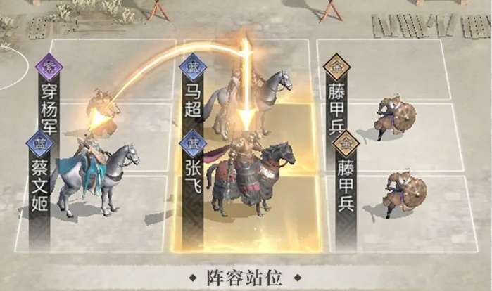 大家在面对敌人生存能力比较强的时候,有这样的武将加上整体的阵容羁绊能力也没有很多的压力,而蔡文姬在这里的话,只是带来整体的治疗支持效果,并且她的羁绊也是可以利用自身强烈的追击效果带来增益能力的,这里的羁绊效果就是余音这个技能,是可以在增加了队友输出能力之后,还可以带来足够的恢复效果,所以这套阵容在触发了两个羁绊之后,整体的效果还是比较全面的,当然在升级作战的时候,大家想要触发这里的追击格子以及羁绊效果的话,那么站位布局一定要注意到,这里马超是一定要踩中蔡文姬以及张飞的追击格子,才可以用到这样的增益效果。
