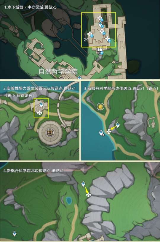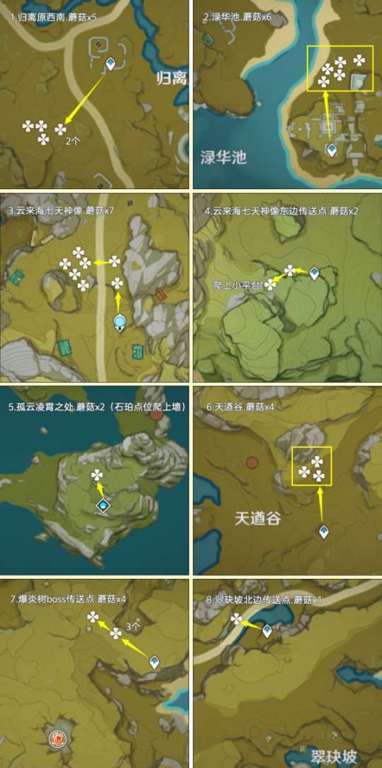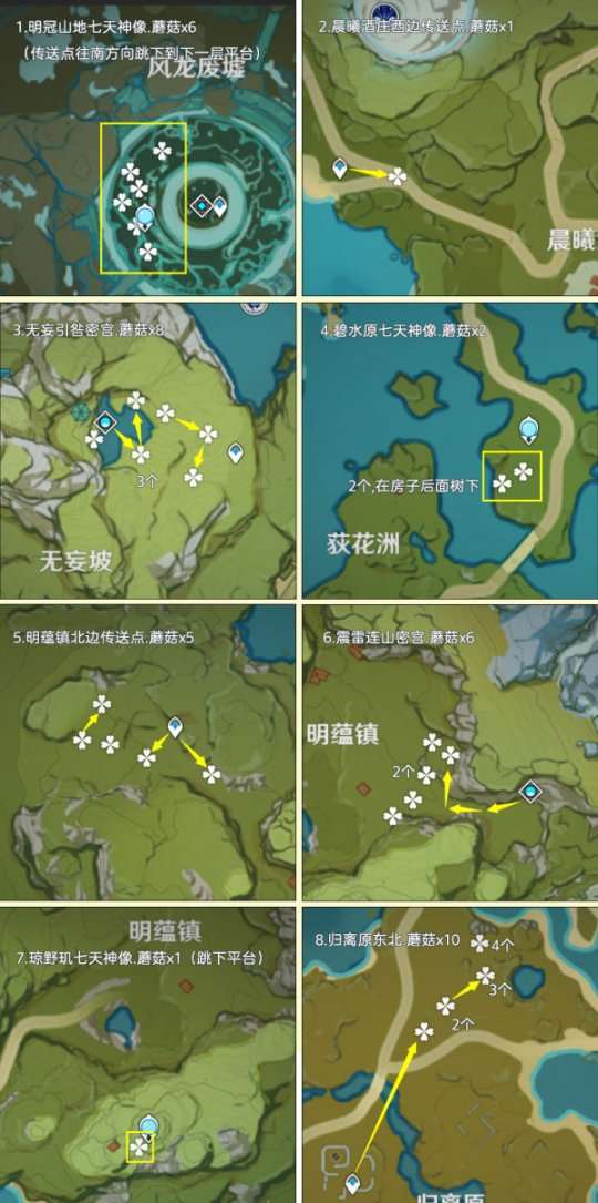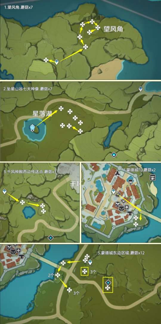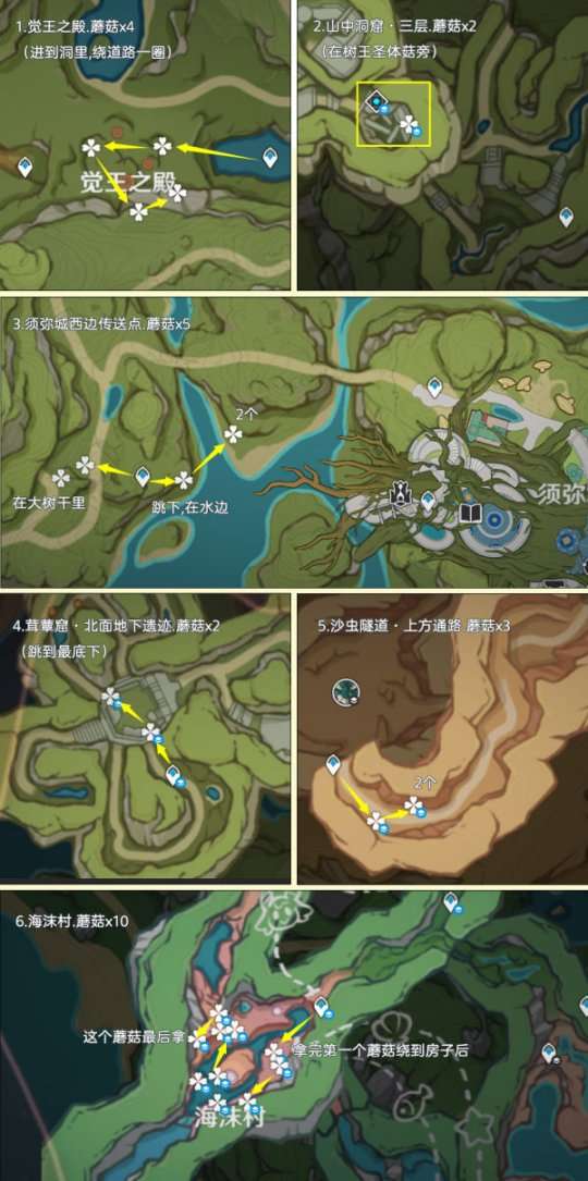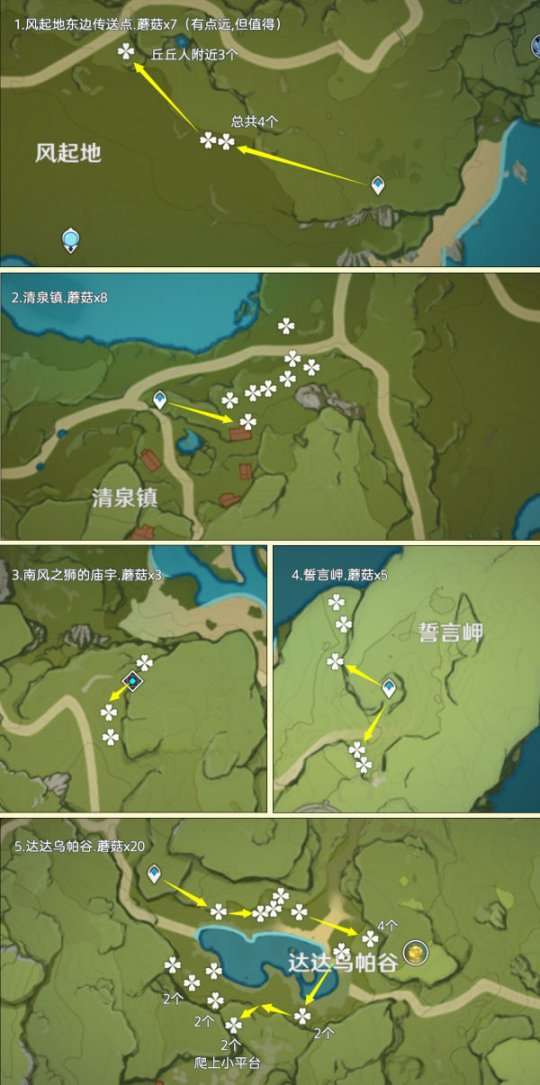 蘑菇分布在提瓦特的所有区域,大部分生长于树下或墙角。其中,高效率可采集数量为283个,再加上NPC购买的20个,可以最多获得303个蘑菇。