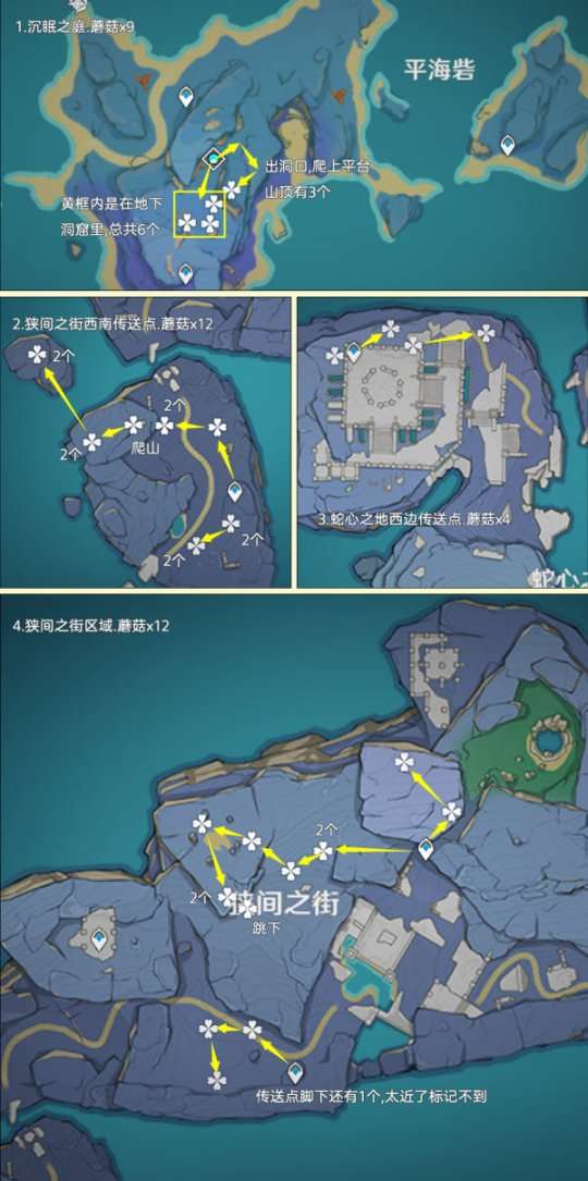 重要提示:1.未特殊标记的均为1个蘑菇;2.鱼钩标记用来表示洞口、分支路线等,以方便寻路。