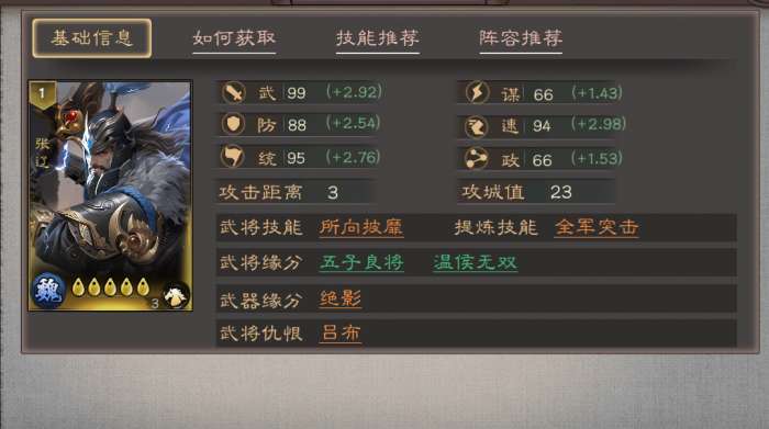 张辽是魏阵营核心输出型武将,定位为大营主力输出,梯度属于T0级一线输出将。