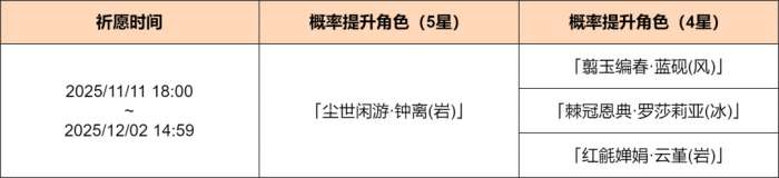 ●活动期间,限定5星角色「尘世闲游·钟离(岩)」的祈愿获取概率将大幅提升!