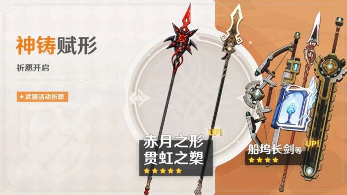 亲爱的旅行者,「神铸赋形」祈愿现已开启:「长柄武器·赤月之形」「长柄武器·贯虹之槊」概率UP!
