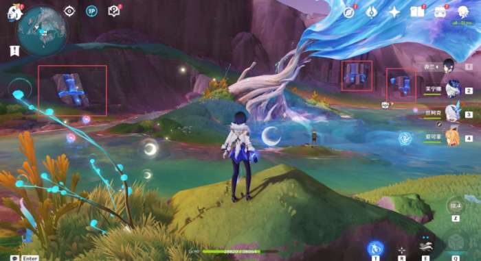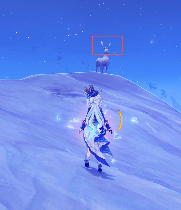 这个地方原本是有一个神瞳的,然后小鹿的头上有几个小精灵,接触过之后在图示的身后会出现精灵滑轨,上去宝箱就会出现,这个宝箱只有上去了罗盘才能扫得到,因为我已经拿过了滑轨已经没有了,所以没办法完全截图,1个华丽宝箱