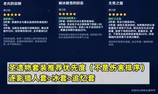 套装选择上,推荐三种方案。优先推荐逐影猎人套,其次是冰套,再次是追忆套。逐影猎人套是最常用的套装,而冰套能提供高达15%的冰属性伤害和40%的暴击率加成,理论上比逐影猎人套的15%普攻和重击增伤和36%的暴击率上限更高。不过,冰套需要同时绑定永冻玩法才能发挥其最大效果。追忆套的机制也很适合莱欧斯利,适合于拥有较好词条的追忆套直接使用;但缺点是缺乏大招,不适用于莱欧斯利等二命以上的角色。