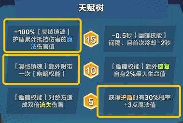 大招·冥域镇魂:获得50层护盾。2秒后造成50%期间护盾累计抵挡伤害的魔法伤害,回复期间50%获得护盾的生命值。生命值低于30%时释放一次冥域镇魂。